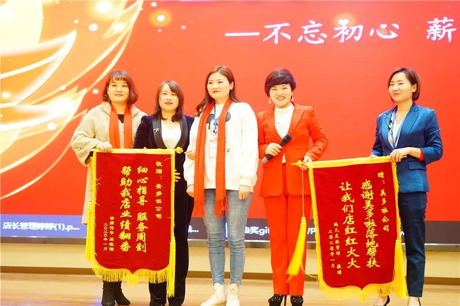 美多啦的老師們,在下店落地的過程中,收獲一批忠實的鐵桿粉絲,來自長沙的周總和左總走上舞臺,給婷婷老師送上錦旗表示感謝,她們的感謝說不完道不盡,為美多啦老師們更添工作的動力。